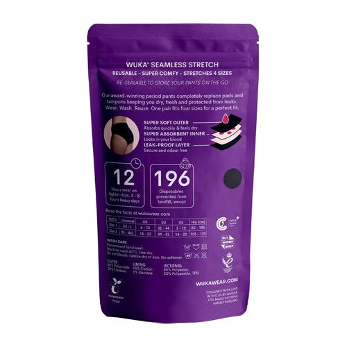 Read MoreWUKA Stretch period pants are the World's First Full Brief, Seamless, Multi-Size period pants, designed to fit every body size and offer maximum protection. Choose from two 'multi - size' pants. Size 1 (XS -L), Size 2 (XL - 4XL).