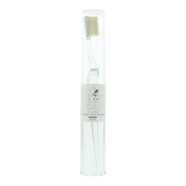 This Acca Kappa Lympio toothbrush offers a traditional design with a distinct retro flair for your daily oral hygiene routine. The vibrant turquoise handle provides an appealing aesthetic while maintaining practical functionality. It is specifically engineered to assist with consistent, effective daily dental care requirements.