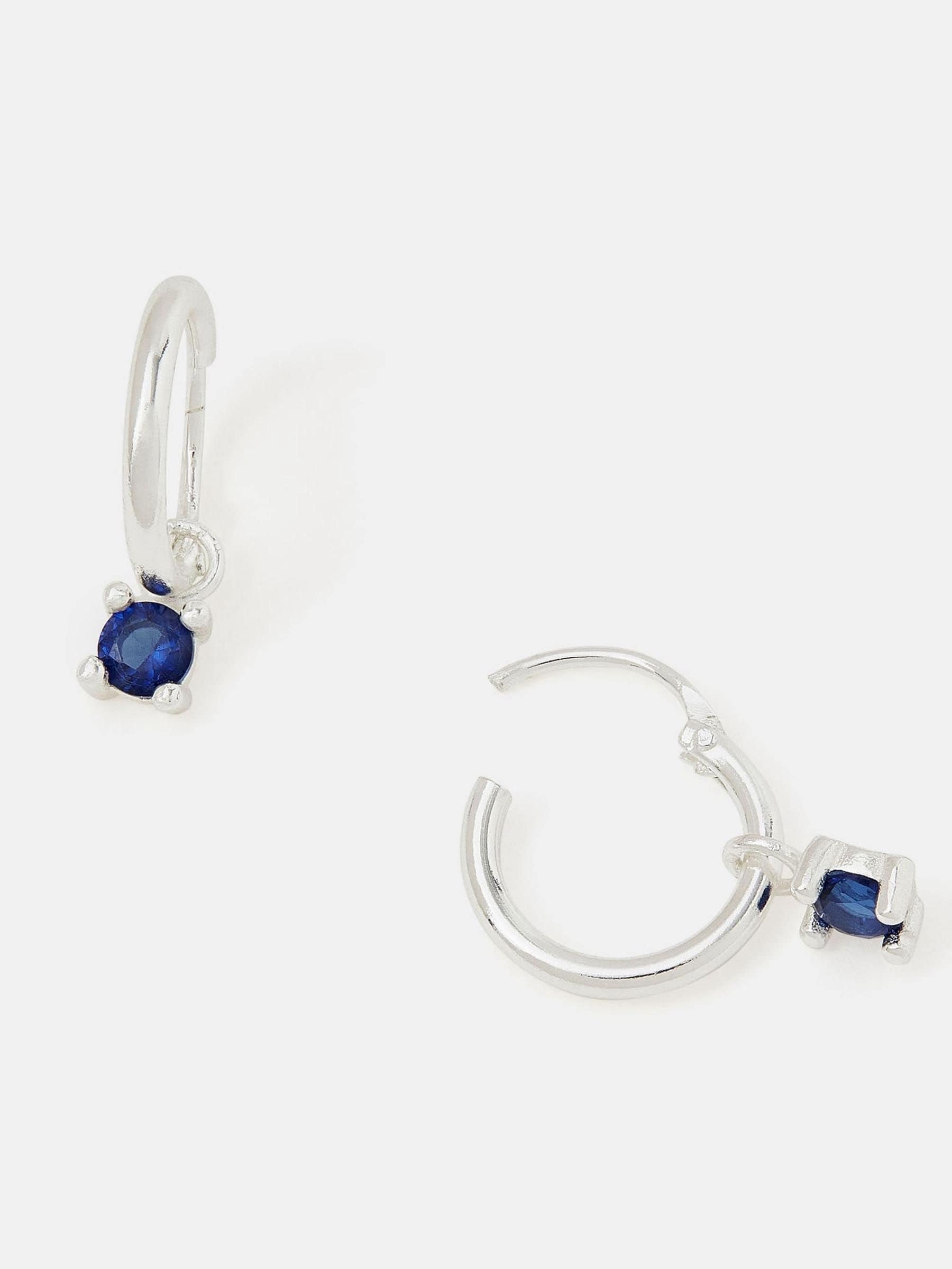 Crafted in sterling silver, these earrings are a must-have for your earscape. In a blue to match the deep ocean waters, these they showcase a diamante stone dangling from the small hoop. Non-refundable.