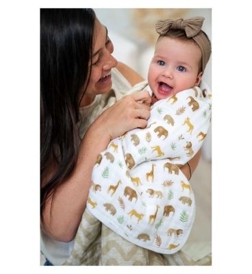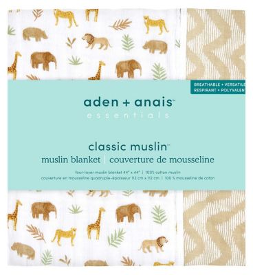 This Aden + Anais Essentials blanket provides lightweight comfort using breathable cotton muslin fabric. The Tanzania design showcases a charming, soft-toned safari animal print on one side for visual interest. Its reversible nature means you get two distinct looks in one versatile piece for your nursery or travel needs.