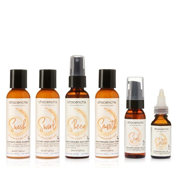 the travel set consists of our full range of products and is also great if youre curious but not ready to commit to our full sizes comes in a beautiful travel bag the travel set includes mini swish 60ml sulphatefree shampoo formulated with aloe vera and coconut oil to provide a gentle cleanse without stripping away moisture mini swirl 60ml siliconefree conditioner made with avocado oil to provide the ultimate slip for quick and easy detangling mini sheen 60ml moisturising spray infused with aloe vera and grapeseed oil to moisturise and revive curly and afro hair without leaving buildup great for moisturising braids mini smooth 60ml moisturising hair cream enriched with fairtrade shea butter and coconut oil to soften and revitalise dry hair mini seal 30ml natural hair oil expertly blended with jojoba oil and castor oil to lock moisture into the hair and prevent breakage mini soothe 20ml scalp oil a lightweight blend of oils including lavender and sweet almond oil to promote healthy hair growth and relieve itchy scalps travel bag the afrocenchix promise our crueltyfree vegan products are free from slssulphates parabens silicons parfumartificial fragrances and anything harsh that beautiful aroma that gets you compliments is a fragrant blend of essential oils we mixed up in the afrocenchix kitchen our inhouse team of scientists create multiple prototypes of our expertly formulated products before running trials with real people until they are just right