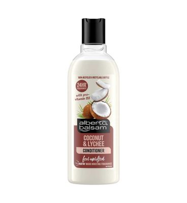 Experience the tropical blend of Alberto Balsam Coconut & Lychee Conditioner, designed to leave your hair feeling fresh and uplifted. This formula is enriched with pro-vitamin B5 to help maintain healthy hair structure. The brand also features an environmental commitment through its packaging design.