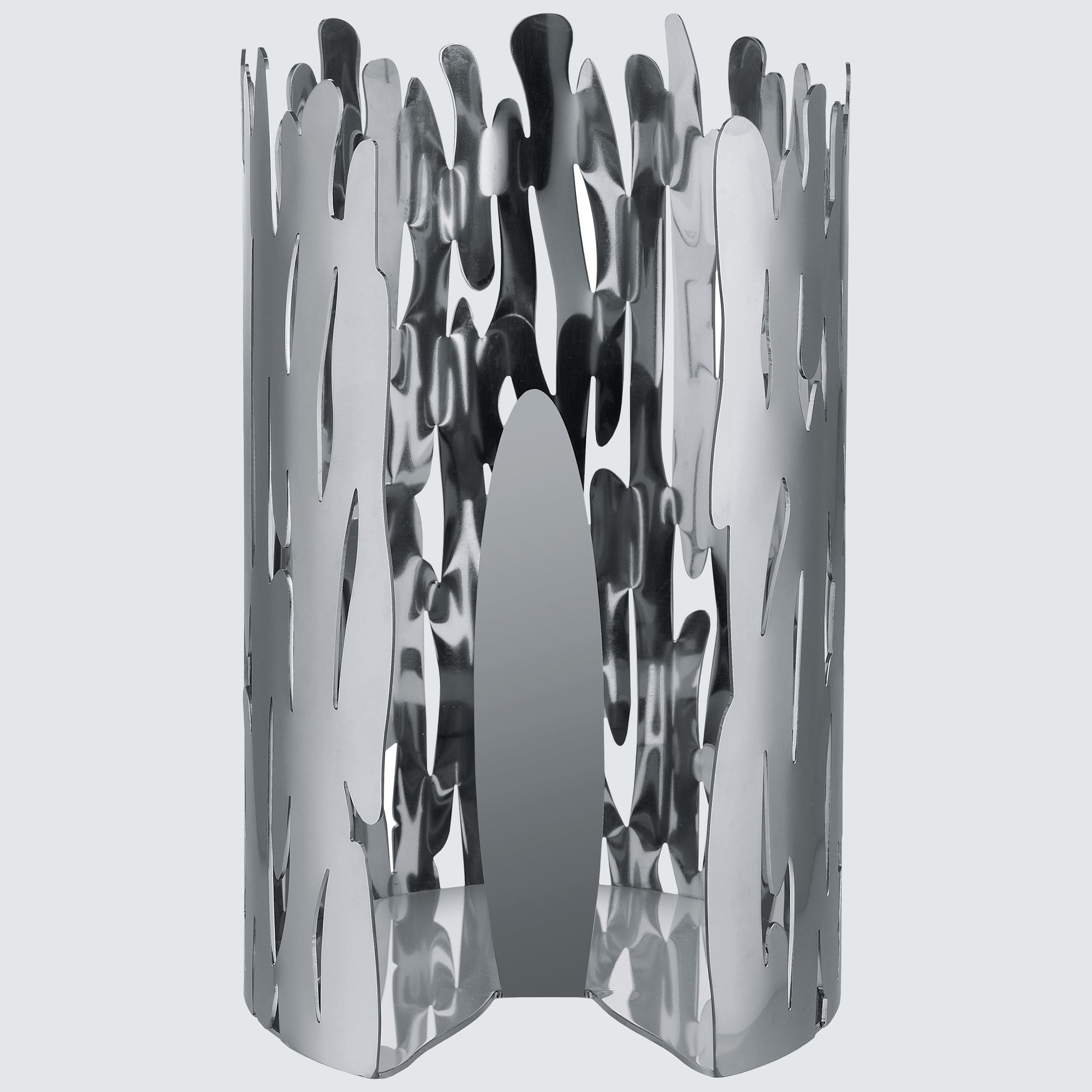 The Alessi Kitchen Roll Holder elegantly embodies the 'Bark' collection's beautiful natural theme. Crafted from durable 18/10 polished stainless steel, its surface features a unique perforated design reflecting organic bark structure through precise laser cutting methods. This premium storage piece brings refined Italian design principles into your everyday kitchen environment today.