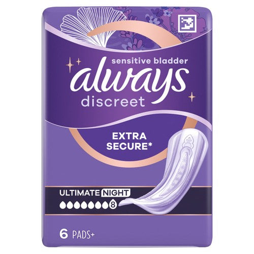 Read MoreOur highest absorbency pad in the range, ideal for worry-free nights. Always Discreet Incontinence Pads Ultimate Night make you feel extra secure, give you extra coverage and absorbency so you can stop worrying about leaks. Each pad is designed to offer you trusted protection from leaks, odour control, instant-dryness, a soft & gentle feel on skin, and a discreet fit. Their structure enables strong protection with an ultra-thin core so you won't have to compromise between comfort and protection. If sneezing or laughing causes bladder leaks, you can feel confident with the discreet and reliable protection offered by Always Discreet Pads. Also useful as maternity pads for postpartum incontinence.