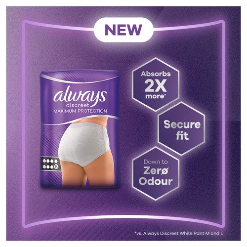 Read MoreDon't let heavy bladder weakness stops you from living your life to the fullest. Always Discreet Incontinence Pants Maximum Protection protect you from heavy leaks thanks to its multi-layer structure that absorbs and locks in leaks in seconds. Maximum Protection Pants neutralise odours thanks to (down to) Zero Odour technology for real peace of mind during day and night. Maximum protection comes with maximum comfort thanks to curve-hugging fit that makes you feel protected and secure. Visit always.co.uk