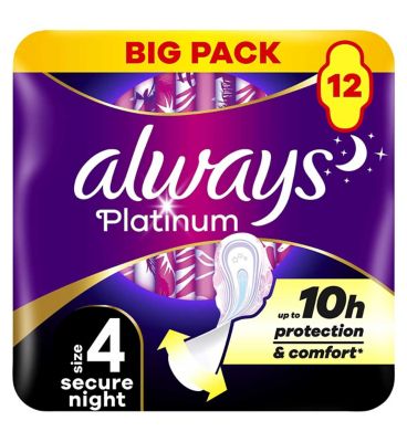 Read MoreAlways Platinum Sanitary Towels with ComfortLock wings are designed to give you better fit* for up to zero leaks, zero shifting and zero discomfort. With Always Platinum Pads your period is the last thing on your mind. Always Platinum Secure Night (Size 4) have a 60%* larger back, so you get more protection where you need it most. *vs. Always Platinum Normal (Size 1)