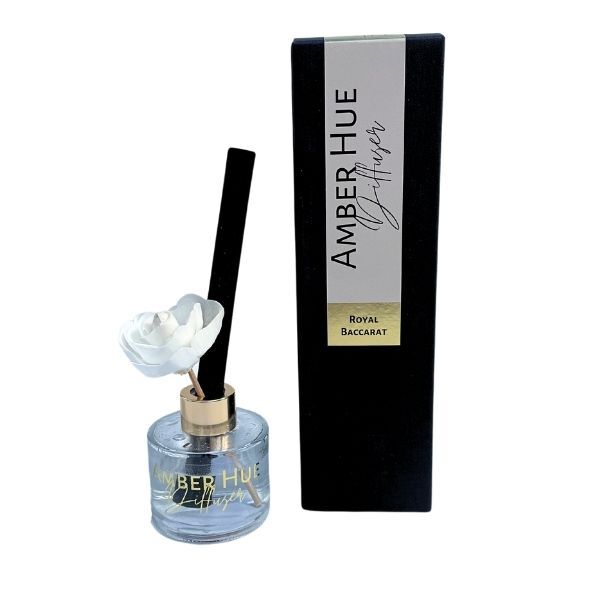 Experience the luxurious Amber Hue Royal Baccarat fragrance with this 100ml flower reed diffuser. This elegant home accessory releases complex scent notes featuring saffron, jasmine, Moroccan almond, amberwood, and resin, softening into cedar and musk.