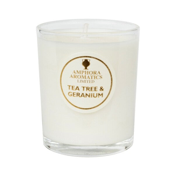 tea tree geranium 20hr pot candle in an attractive glass pot a balancing restorative scent in an attractive ivory colour made from pure essential oils and 100 natural plant wax wax comes from a natural sustainable plant source our candles contain no petroleum based paraffin wax and animal products reuse the glass pot for tealights or trinkets to recycle the pot place in your normal clear glass recycle bin also available in a larger 40 hour pot and as a reed diffuser vegan friendly