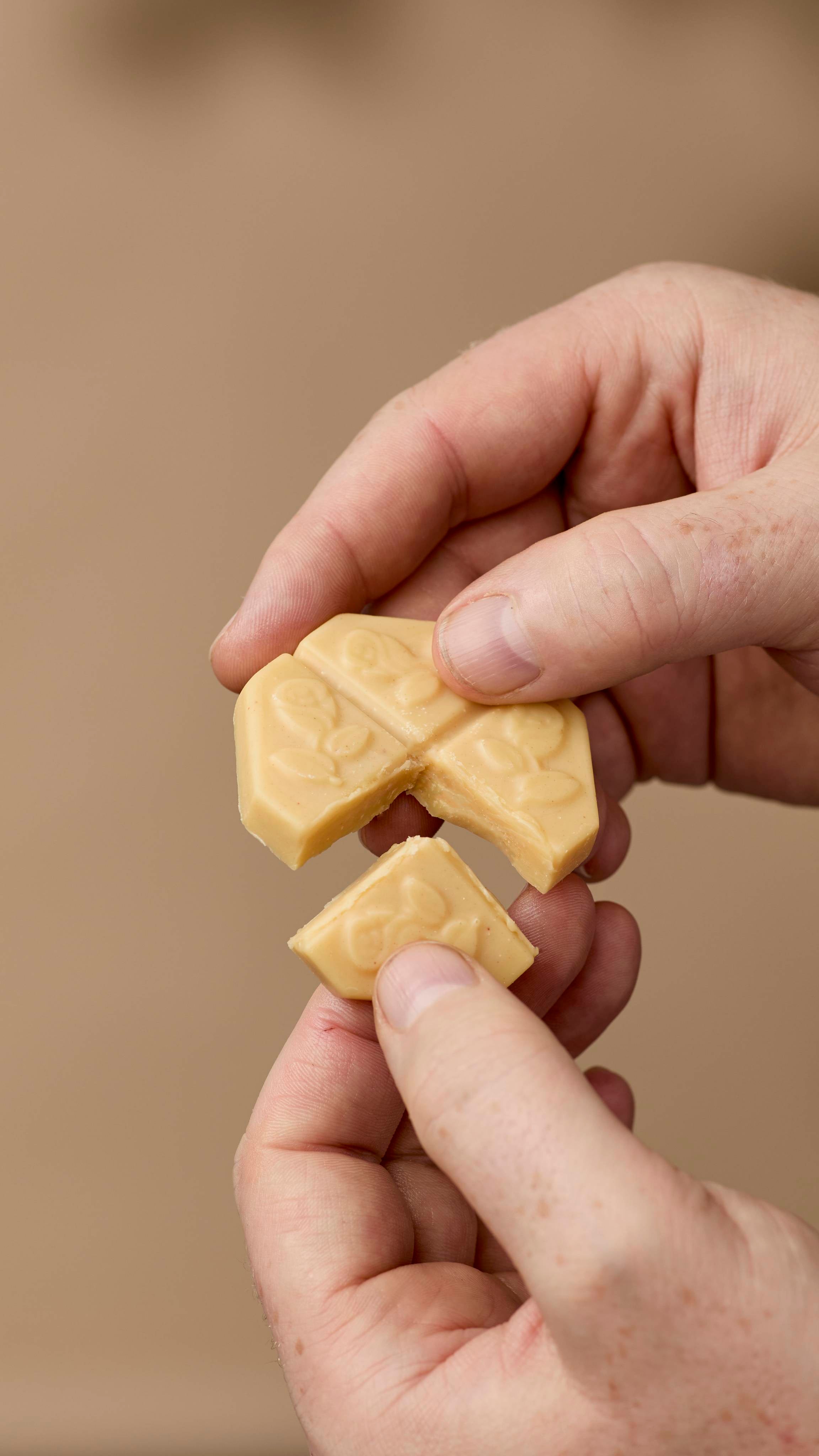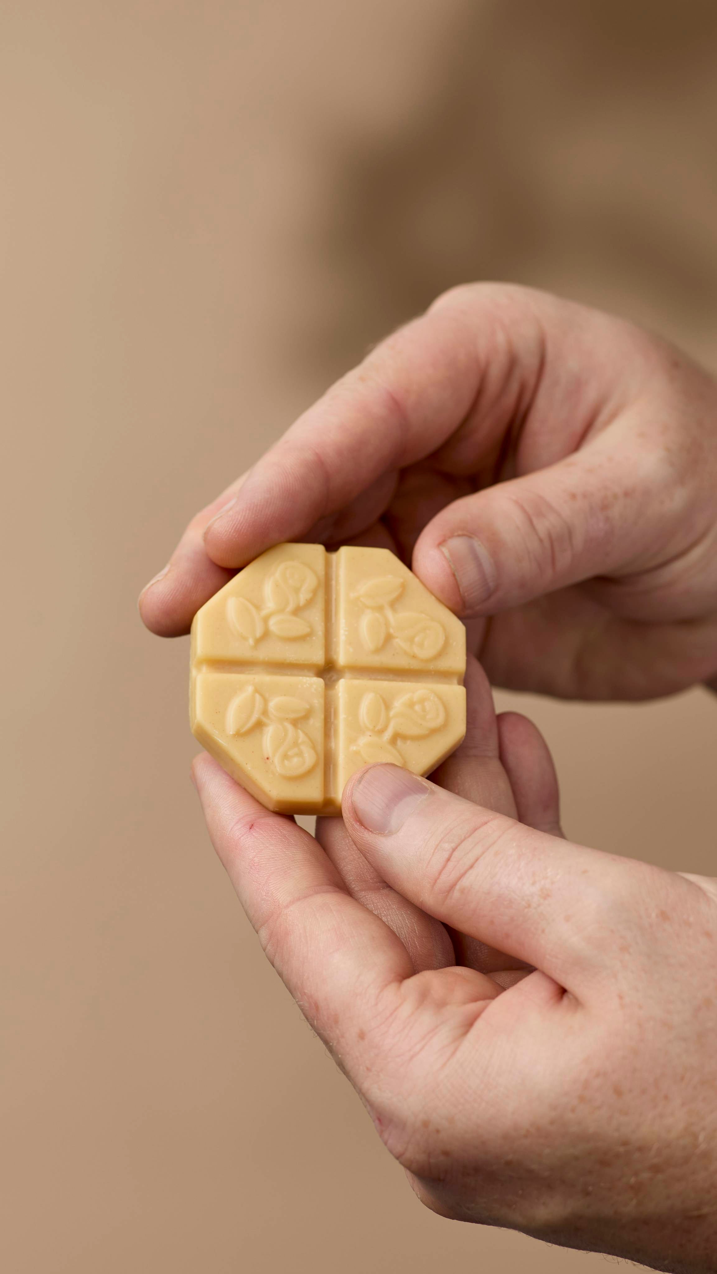 Perfect for night time use, our snappable, new-look, solid face oil is now the perfect shape for a relaxing facial massage. Break off a segment and sweep across the brow bone and up over the cheekbones, allowing the warmth of your skin to gently melt the butters and oils. Work in with clean fingers using upward strokes to encourage a natural glow and promote a lifted look.