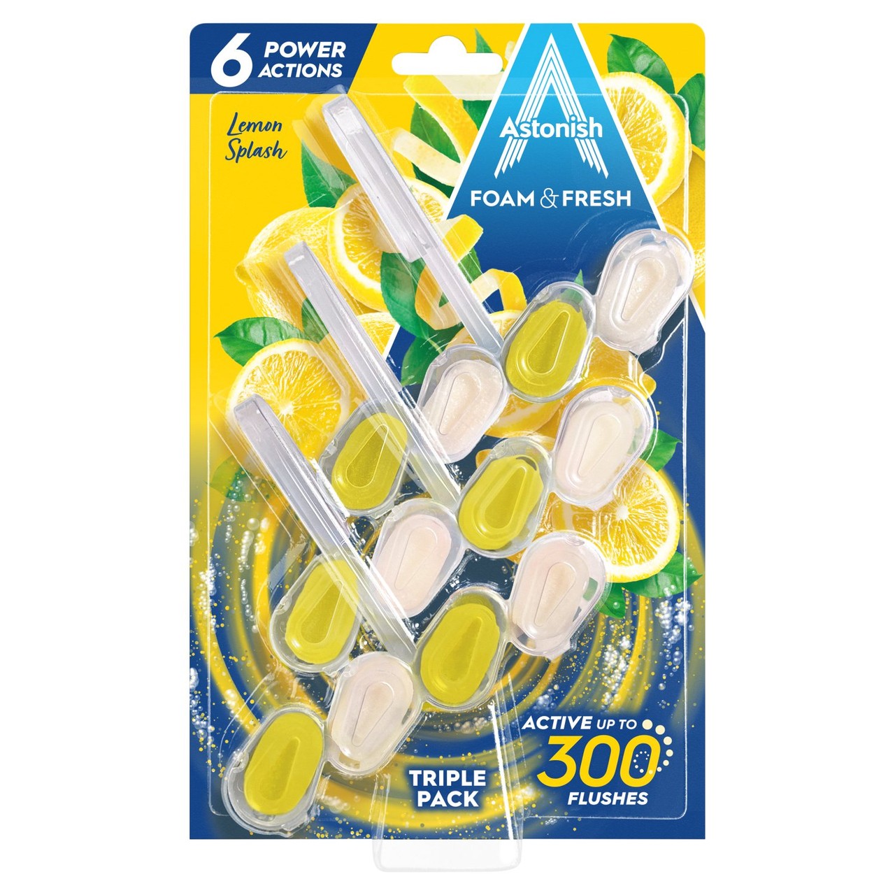 This Astonish Foam & Fresh Toilet Rim Block offers powerful, multi-action cleaning for your toilet bowl. This triple pack delivers 6 power actions with every flush, keeping your toilet clean and smelling of refreshing lemon splash. These easy-to-use blocks work continually to maintain hygiene between deep cleans.