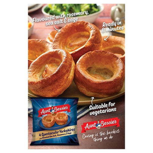 Aunt Bessies offers a pack of four of their largest Yorkshires, ideal for enhancing your traditional Sunday roast meal. These generously sized puddings are designed to bring flavour and volume to your dinner plate. Keep them ready in your freezer for whenever a proper roast is required. This product is suitable for vegetarians.