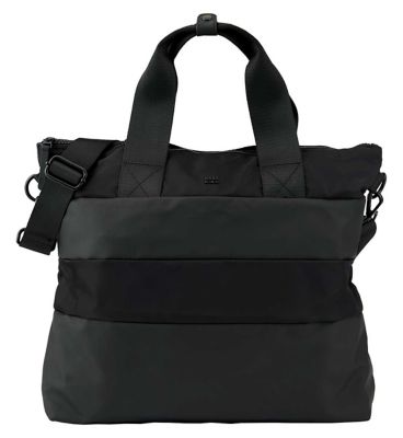 This versatile bag offers multi-functional use, converting between a tote, shoulder bag, and backpack easily. It is constructed from 100% sustainable recycled materials, aligning practical utility with eco-conscious design principles. The sleek black finish ensures this durable bag complements various personal styles seamlessly throughout the day.