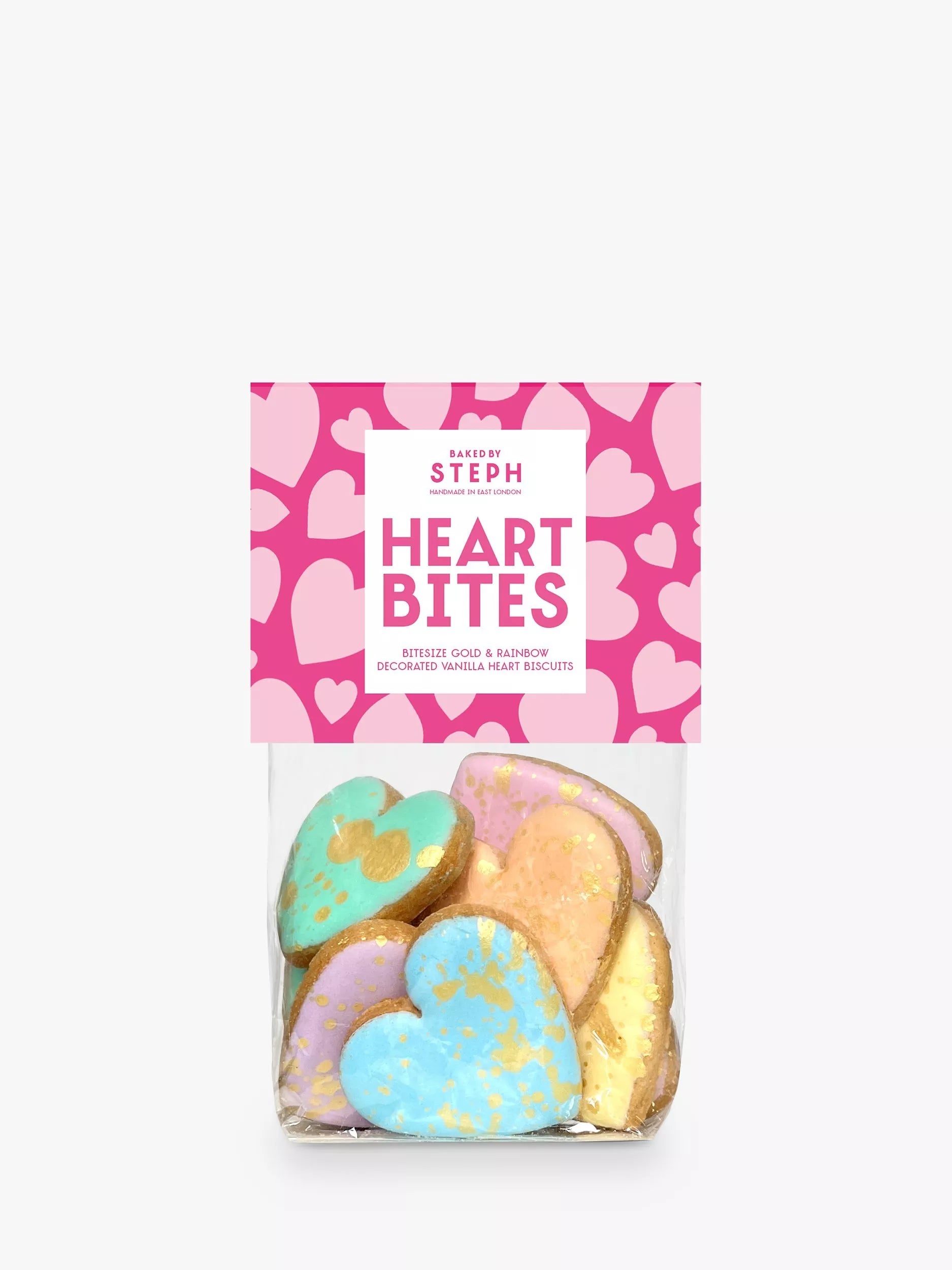 Give a bit of love with these bitesize gold and rainbow decorated vanilla heart cookies, presented in a tie top bag.