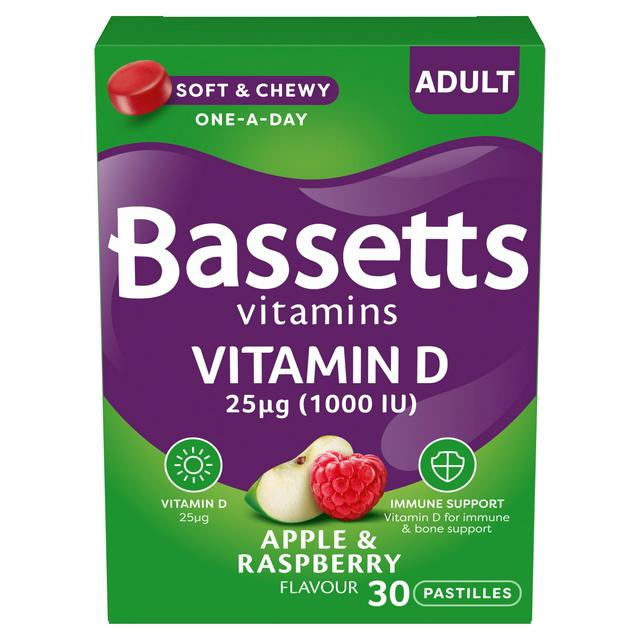 These soft and chewy Bassetts pastilles offer a pleasant apple and raspberry flavour in a convenient one-a-day format. Each pastille contains 25µg (1000 IU) of Vitamin D to support overall wellness. They are formulated with natural colours and flavours and contain no added sugar, relying only on naturally occurring sugars.