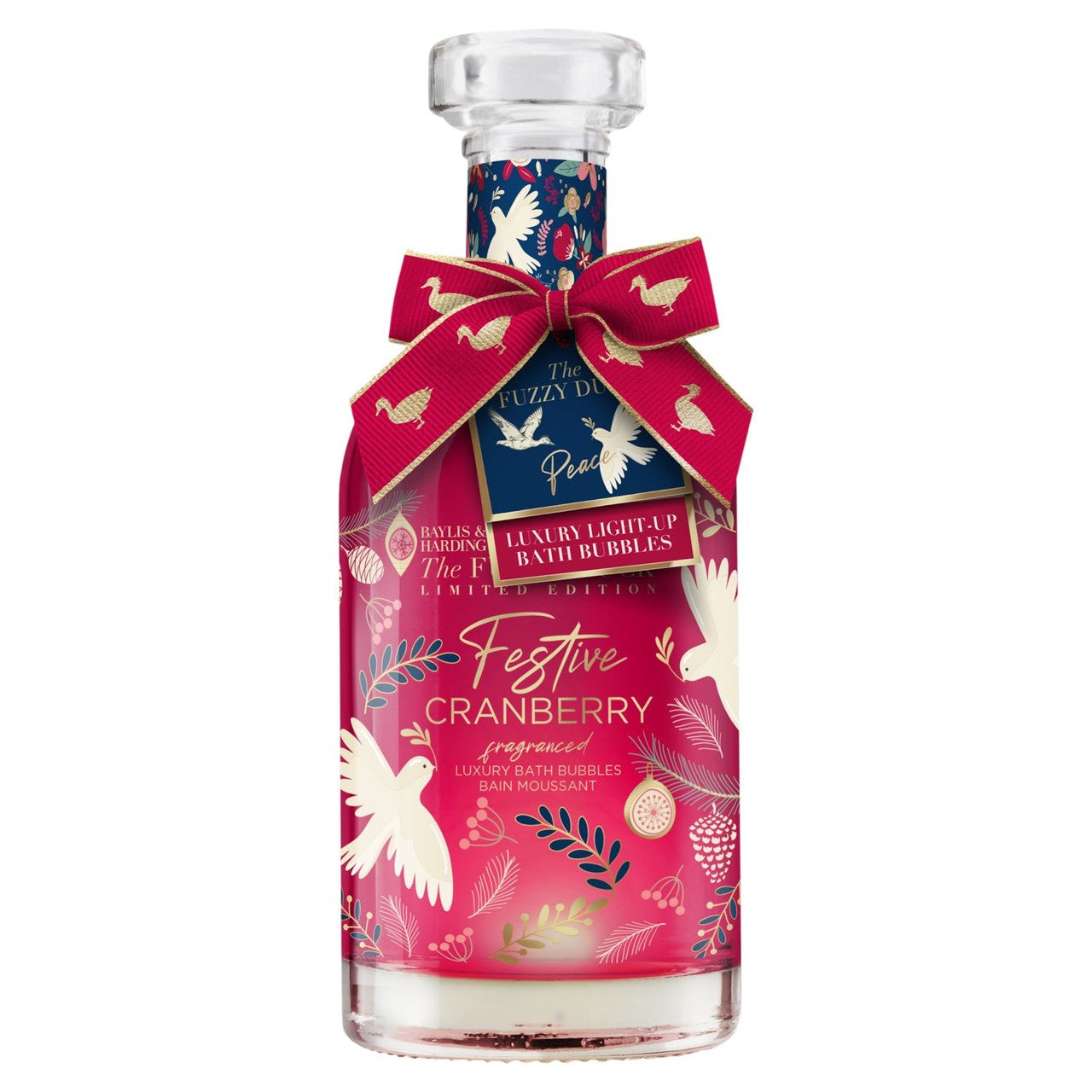 This Baylis & Harding gift set features a gorgeous 500ml decanter of Cranberry scented bath bubbles. The glass decanter is designed to light up, offering the perfect atmosphere for relaxation. Activate the light via a button located at the base to create a magical scene during your soak. This product is also suitable for vegans.