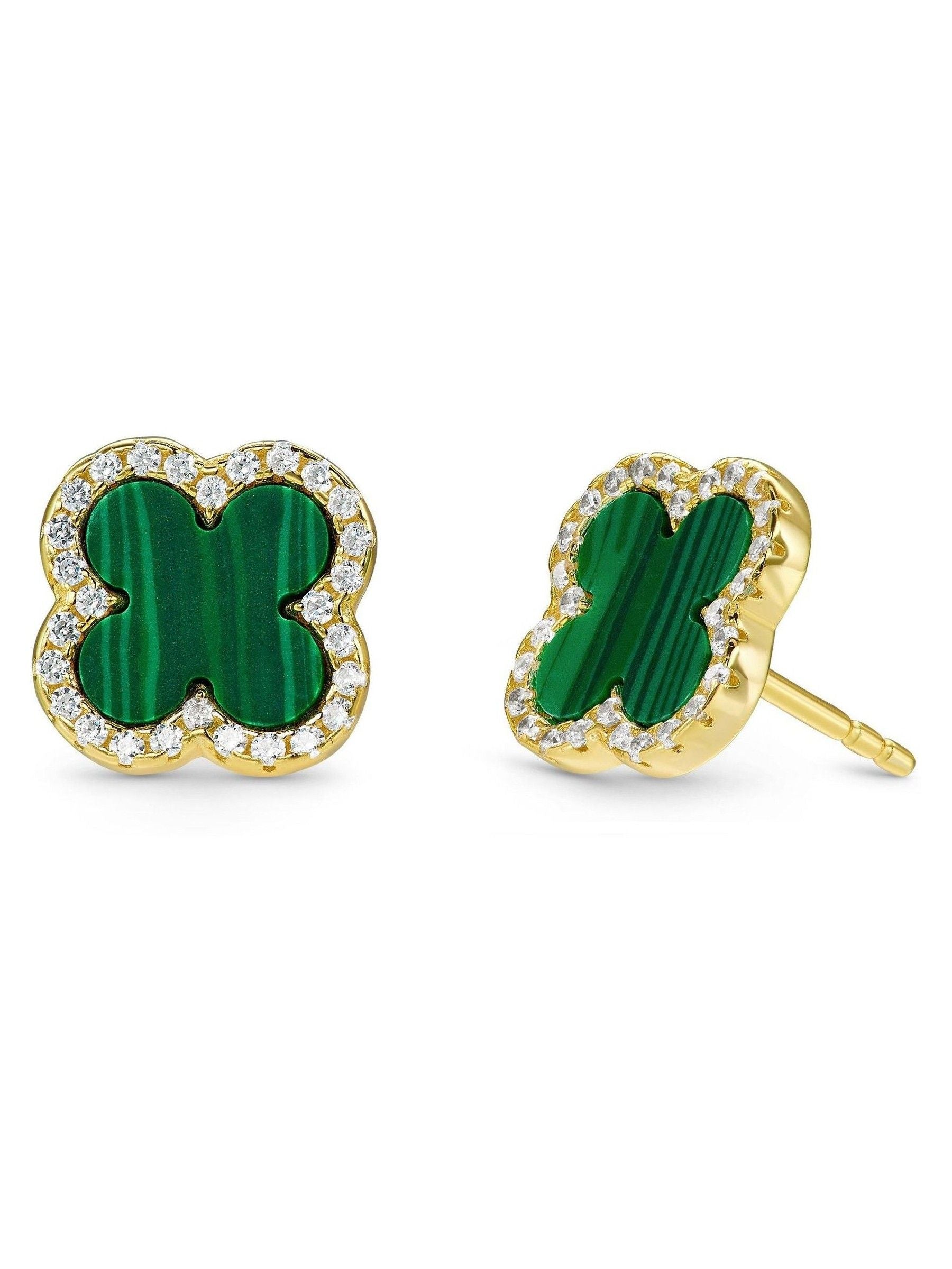 Highlight your luxurious style with these Gold Plated silver Cubic Zirconia Malachite Clover Earrings. Adding a touch of sophisticated glamour to every look, capture attention and make a statement with these captivating earrings. Each piece is unique, displaying the natural beauty of malachite which may vary in colour and pattern.