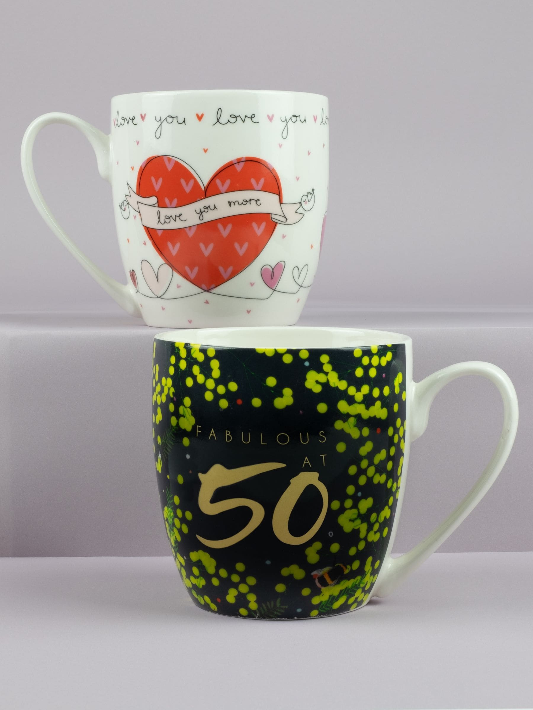 Wrap around print, two tulip-shaped mug set - perfect for a morning coffee for your 50 year old friend.