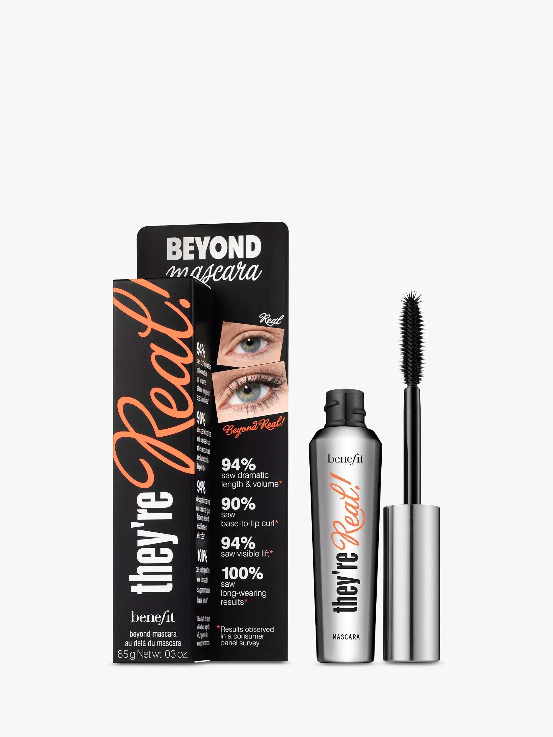 Unlock your lashes' full potential with Benefit They're Real! mascara. This iconic mascara delivers dramatic length, curl, and volume, creating a captivating lash look. Perfect for achieving a glamorous, wide-eyed effect.