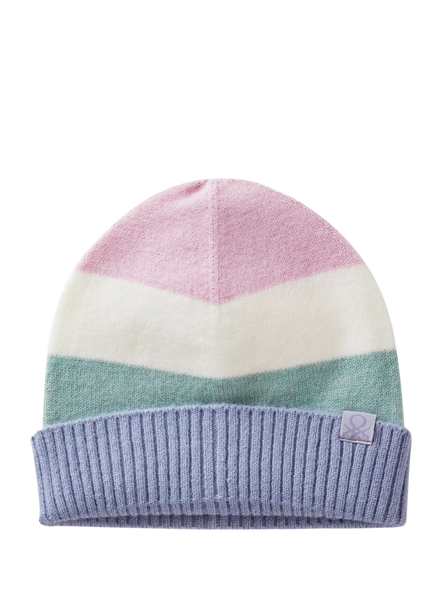 A cosy beanie by Benetton with a colour block stripe and a logo patch.