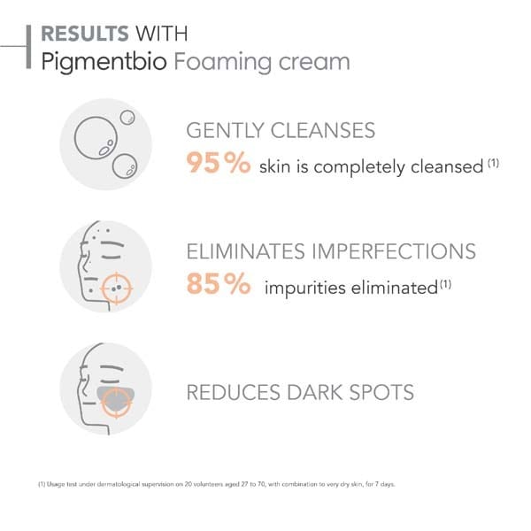pigmentbio foaming cream is a brightening hydrating cleanser that promotes the disappearance of dark spots and keeps them from reappearing creamy foam texture soap free can be used as a mask for uneven skin tone skin prone to pigmentation face upper body dermatologically tested