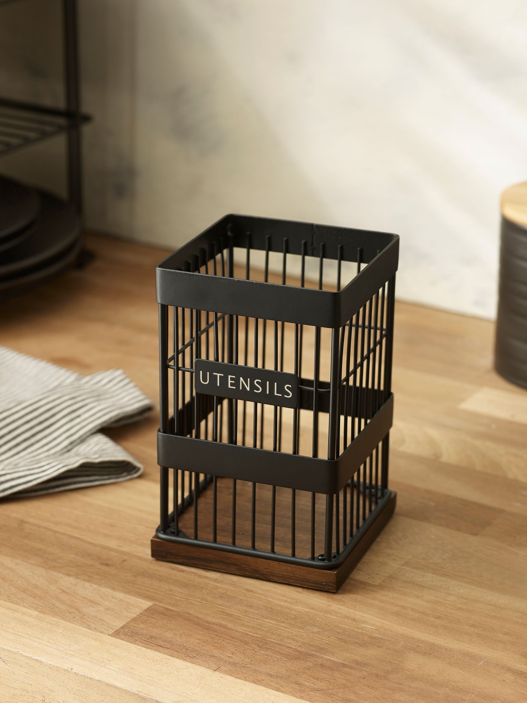 Our Bronx metal utensil holder is inspired by industrial design. Featuring a dark wood and matte black metal finish, this piece is perfect for storing your utensils and keeping them easily accessible for when you need them. Utensils not included.