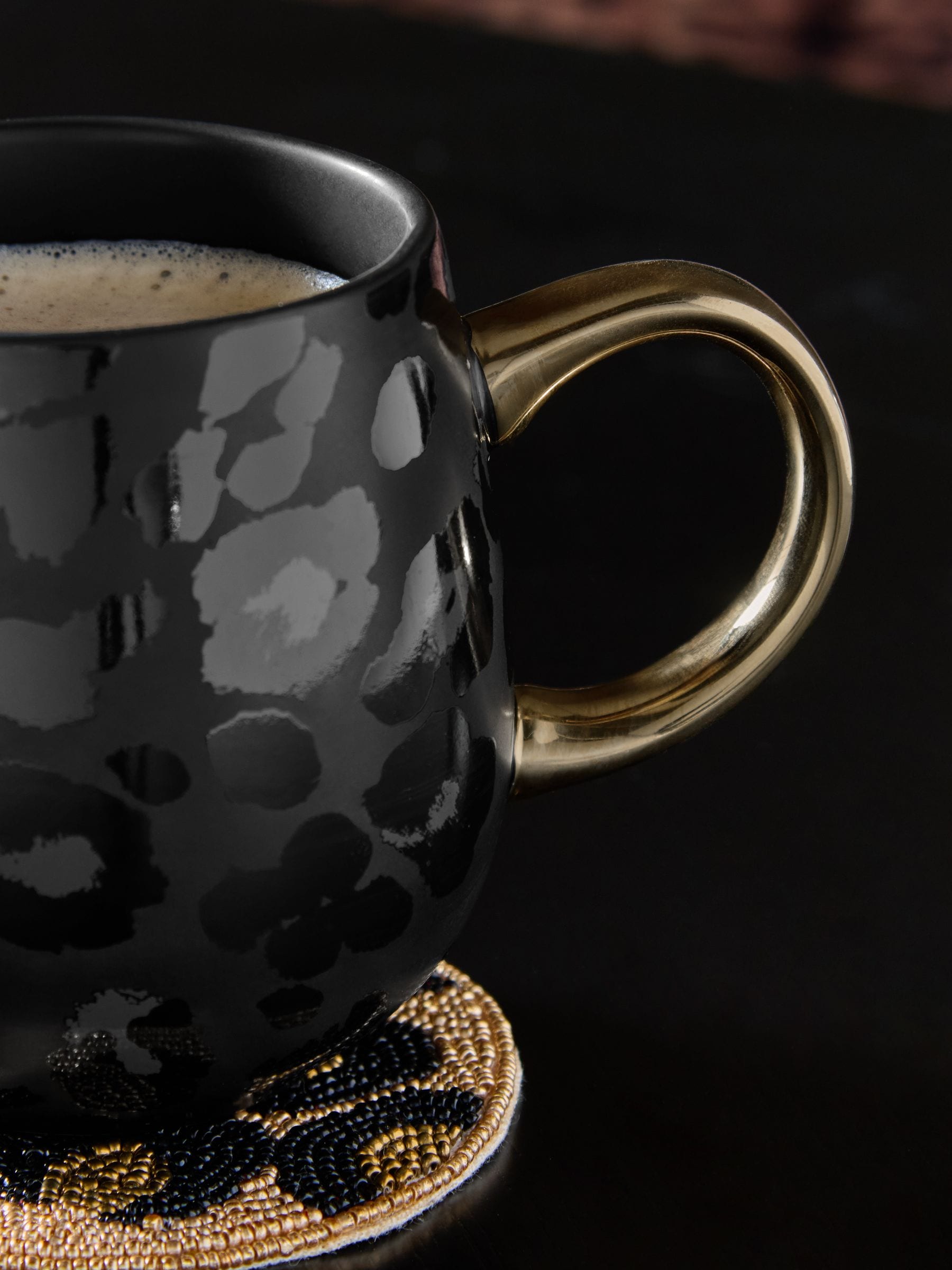 Add a touch of elegance to your mug collection this season with our black leopard print mug. This stunning mug features an all-over leopard print pattern, a sophisticated matte finish, and a luxurious gold-tone handle, making it the perfect mug for your favorite hot drinks.
