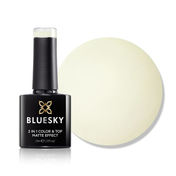 Bluesky Citrine is a 2-in-1 product offering a very pale lemon hue with subtle charm. This versatile polish functions as both a matte treatment and a durable top coat, designed for extended wear.