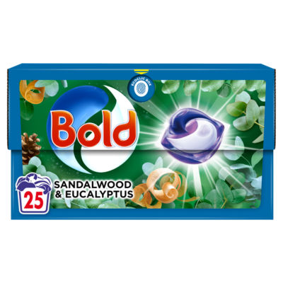 These Bold Pods washing liquid capsules deliver deep cleaning performance across 25 washes. Each capsule combines powerful detergent action with a built-in Lenor softener for fabric conditioning. The fragrance blends soothing sandalwood and enchanting eucalyptus notes, evoking a sense of woodland tranquility.