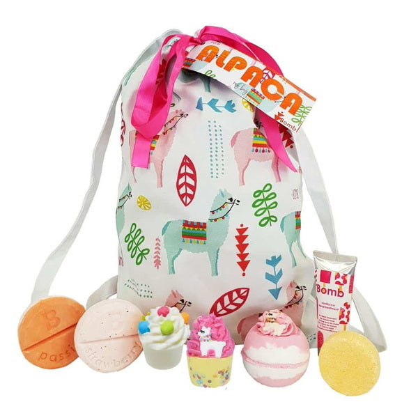 contains 1x bath blaster 2x bath mallows 2x shower mixers 1x shampoo bar 1x hand treatment this set will make you feel as relaxed as a chilled alpaca scent sweet fruity beautifully gift wrapped handmade in the uk proudly crueltyfree our collection of fun wash bags is made from highquality organic cotton perfect for storing your bomb goodies and so much more these wash bags are suitable for all ages and versatile enough to carry your bath essentials cosmetics or personal items no probllama blaster 160g kick back and relax with the no probllama bath blaster infused with soothing essential oils this bath bomb fizzes away to reveal calming scents while softening the water and your skin the perfect way to unwind after a busy day drama llama mallow 50g let the drama llama melt your stress away with this ultrasoft bath mallow packed with cocoa and shea butter it creates a silky bath that nourishes and hydrates while the delightful fragrance lifts your mood passion pom pom mallow 50g infused with an energising blend of fruity essential oils this passion pom pom mallow adds a fun and playful touch to your bath time its creamy buttery base moisturises your skin leaving it soft and radiant passion shower mixer 95g transform your shower into a rejuvenating experience with the passion shower mixer this vibrant fruity shower mix lathers up beautifully with a refreshing scent to awaken your senses and energise you throughout the day strawberry shower mixer 95g bring the sweet irresistible fragrance of ripe strawberries into your shower the strawberry shower mixer creates a creamy luxurious lather that nourishes your skin with every use leaving you feeling refreshed and pampered back to my roots shampoo bar 50g this ecofriendly shampoo bar is packed with natural ingredients that gently cleanse and nourish your hair with a refreshing rootbased scent and nourishing oils itll leave your hair soft shiny and healthy vanilla ice hand treatment 25ml give your hands the pampering they deserve with the vanilla ice hand treatment infused with rich butters and a dreamy vanilla scent this hand cream deeply moisturises and softens leaving your hands feeling silky smooth each product in this set has been thoughtfully crafted to elevate your selfcare routine leaving you relaxed rejuvenated and ready to take on the world with a smile