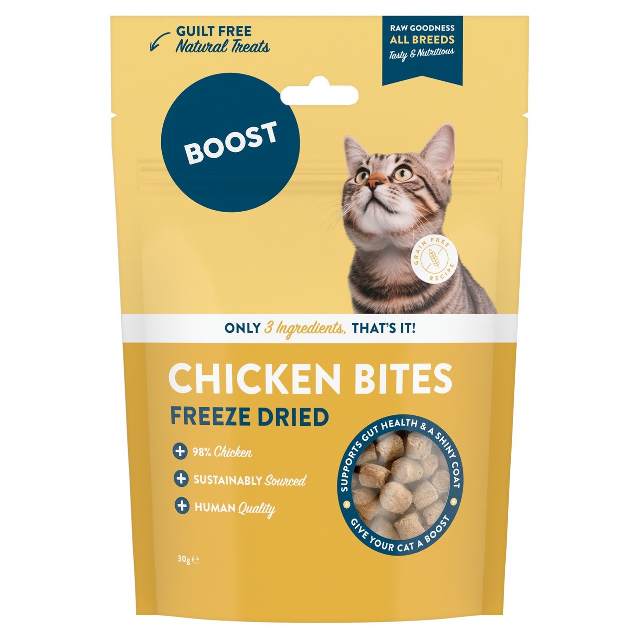 Boost Pet offers freeze-dried chicken pieces specifically formulated as nutritious cat treats. The freeze-drying process is used to effectively retain vital nutrients within the quality chicken pieces. These snacks are derived from meat sourced within the human food supply chain, maintaining high standards before processing.