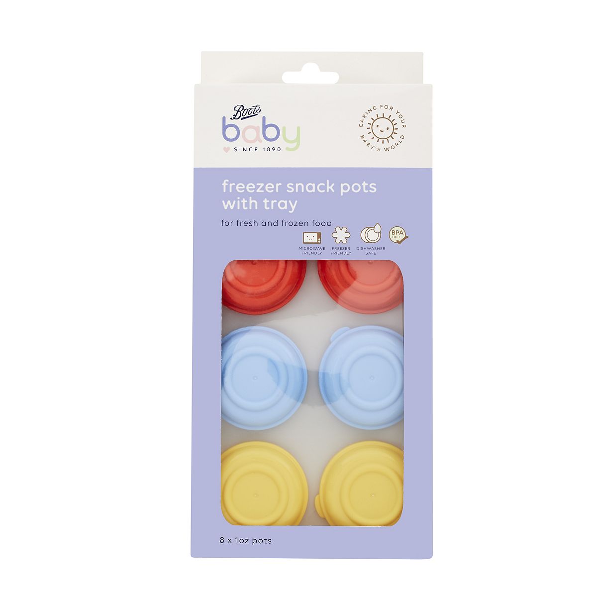 Boots Baby Freezer Pots Tray 8 packPack our 1oz Freezer & Snack Pots full of fresh or frozen yummy treats, and enjoy wherever your adventures take you. Even better, our handy little tray will stop them wobbling over in your freezer.We've made them from steriliser and dishwasher friendly materials, so feel free to pop it in for easy cleaning. That's one less thing to worry about.