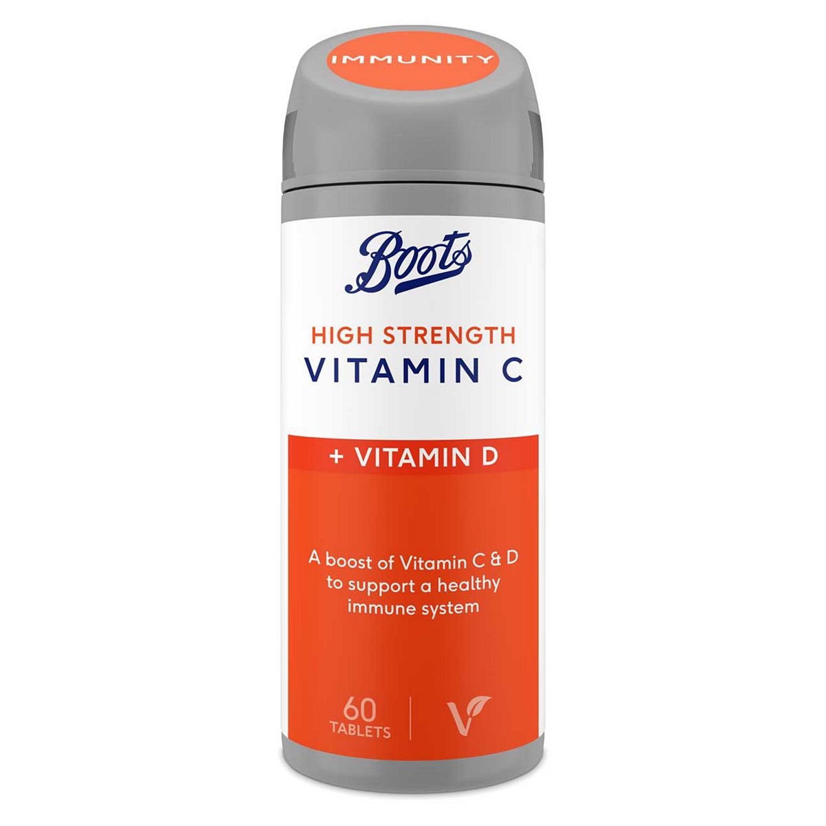 Boots High Strength Vitamin C + Vitamin D, 60 TabletsWhat does it do?Combining both Vitamins C and D together, this high strength supplement provides dual action immune support in one tablet. Vitamin C is water soluble and is only stored in the body in small amounts, whilst Vitamin D is mainly obtained by sunlight, so a regular intake is important to support a healthy immune system. The UK Department of Health recommends taking a daily supplement containing 10ug of Vitamin D.