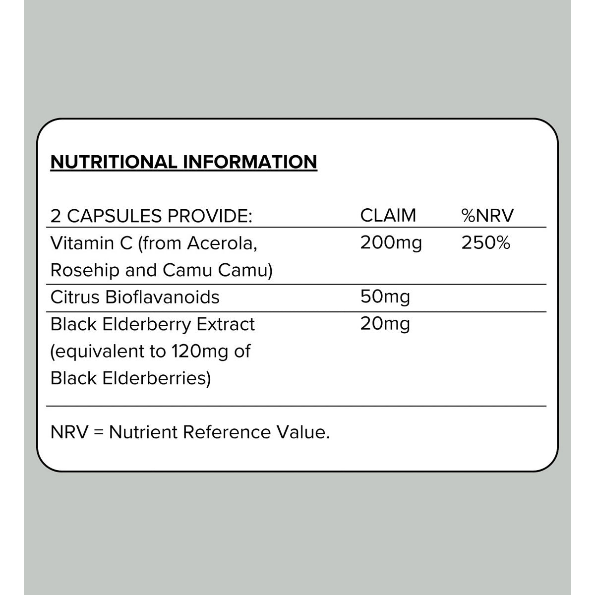 Acerola Cherry, Capsule Shell (Vegetable Cellulose), Camu Camu, Rosehip, Citrus Bioflavonoids, Black Elderberry, Rice Fibre, Rice Extract.