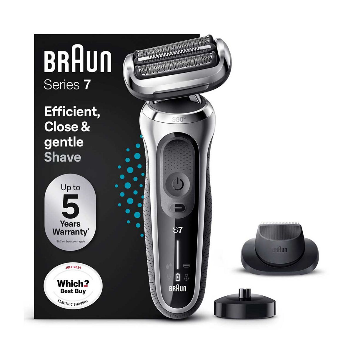 Braun Series 7 electric shaver for men with 360° adaptation for a smooth shave. Features Autosense technology that reads and adapts to your beard density, removing more hairs in every stroke.