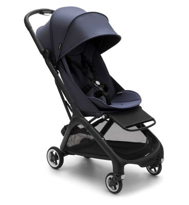The Bugaboo Butterfly Travel City Pushchair is designed for effortless urban navigation and travel convenience. This model features a sleek black frame contrasted with distinctive Stormy Blue fabrics. It offers parents a robust yet portable solution for outings with their child.