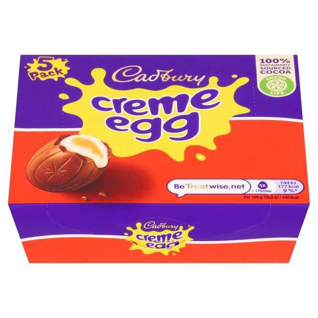 Bite into a deliciously thick Cadbury milk chocolate egg and savour its gooey, indulgent white-and-yolk fondant centre. There are a million ways to eat it, but thereâs only one Cadbury Creme Egg. Made with sustainably sourced cocoa. Vegetarian friendly.