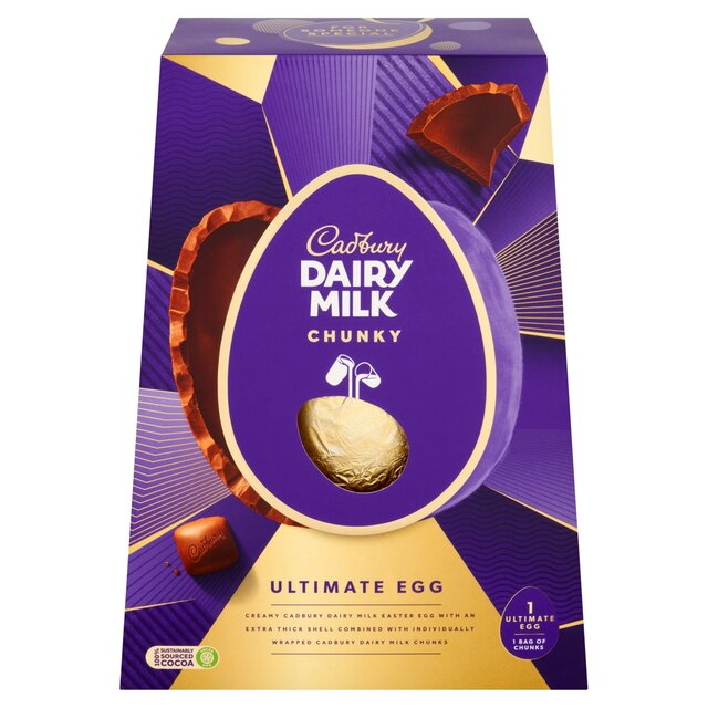 Creamy Cadbury dairy milk Easter Egg with an extra thick shell combined with individually wrapped Cadbury dairy milk chunksYour Easter Egg has been made with Cadbury dairy milk