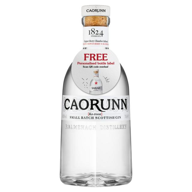 Caorunn is a premium Small Batch Scottish Gin produced at the historic Balmenach Distillery. This spirit showcases a unique character derived from its carefully selected range of traditional and native Scottish botanicals. The brand highlights its heritage, noted by the founding year 1824 prominently displayed on the distinctively shaped bottle.
