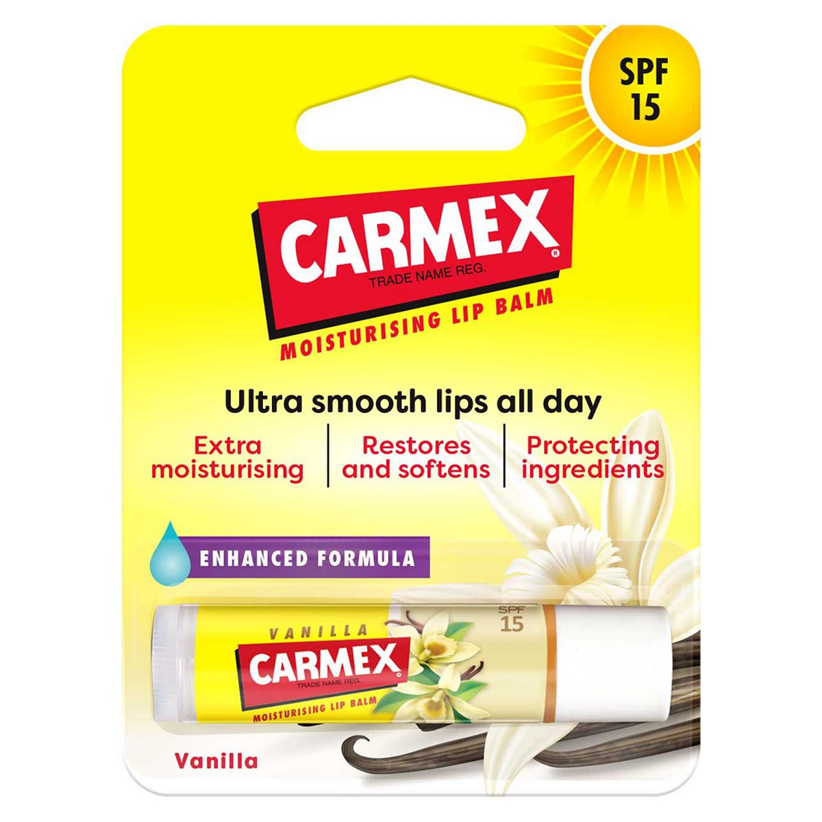 Discover how this ultra smooth, extra moisturising balm makes your lips feel incredible. The Carmex Ultra Moisturising formula provides superior, enhanced hydration and makes even the driest lips soft and suppler again. This fun, creamy flavour is unlike anything you have tried from Carmex before. Our exotic Vanilla flavour soothes and calms your senses while the SPF 15 helps protect your lips.For over 75 years the Woelbing family has been making Carmex Lip Balm. Tested on family members - not animals.It Soothes. It Moisturises. It Protects.