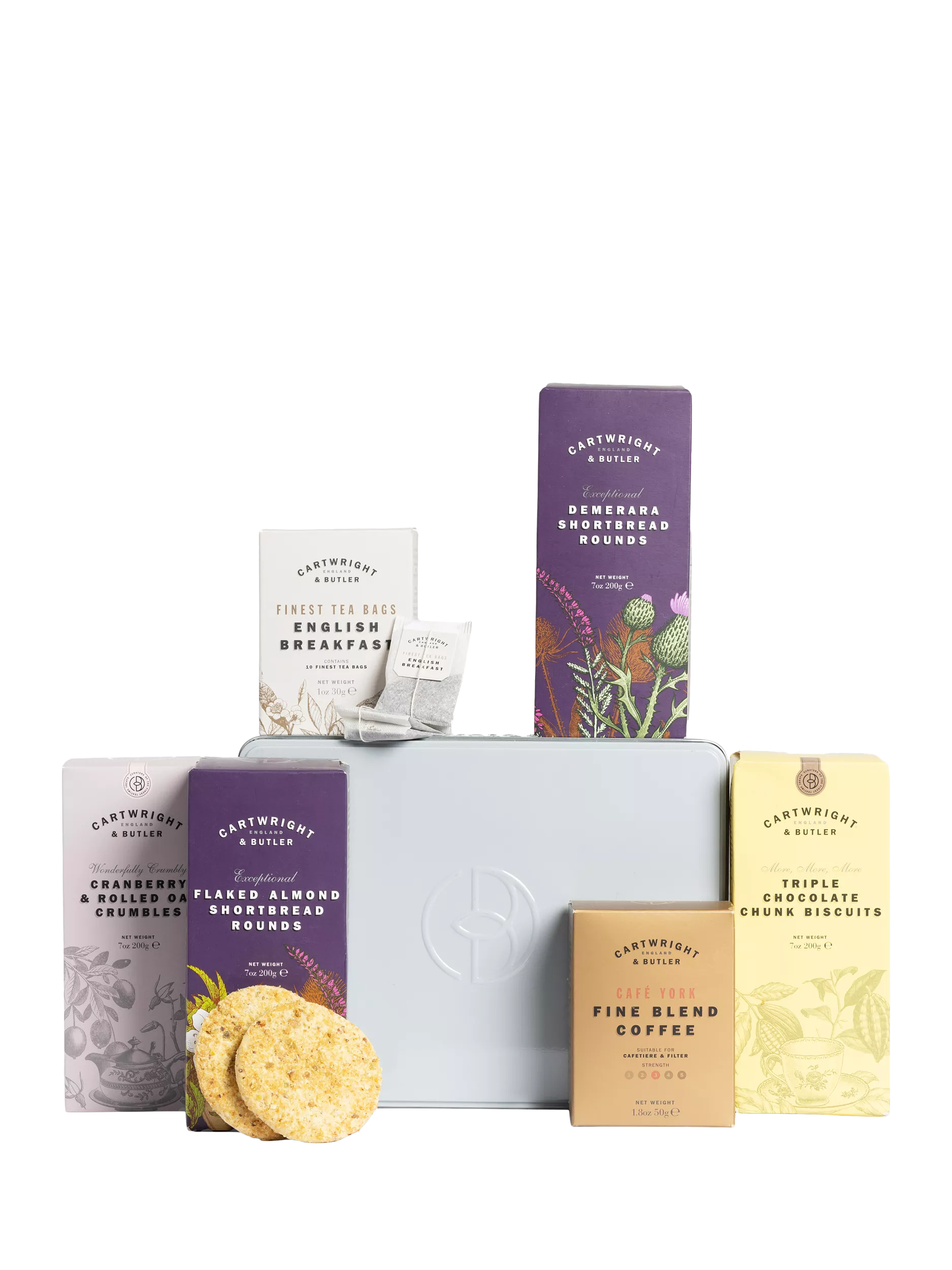 Who doesn't love a tea or coffee with something delicious to dunk? You can do exactly this with the selection of treats in the Brew & Biscuit Hamper. The reusable grey tin is filled with four of our favourite luxury biscuits: Triple Chocolate Chunk Biscuits, Cranberry Crumbles, Flaked Almond Shortbread Rounds and Demerara Shortbread Rounds. This Cartwright & Butler selection is partnered with the Finest English Breakfast Tea and Cafe York Fine Blend Coffee.