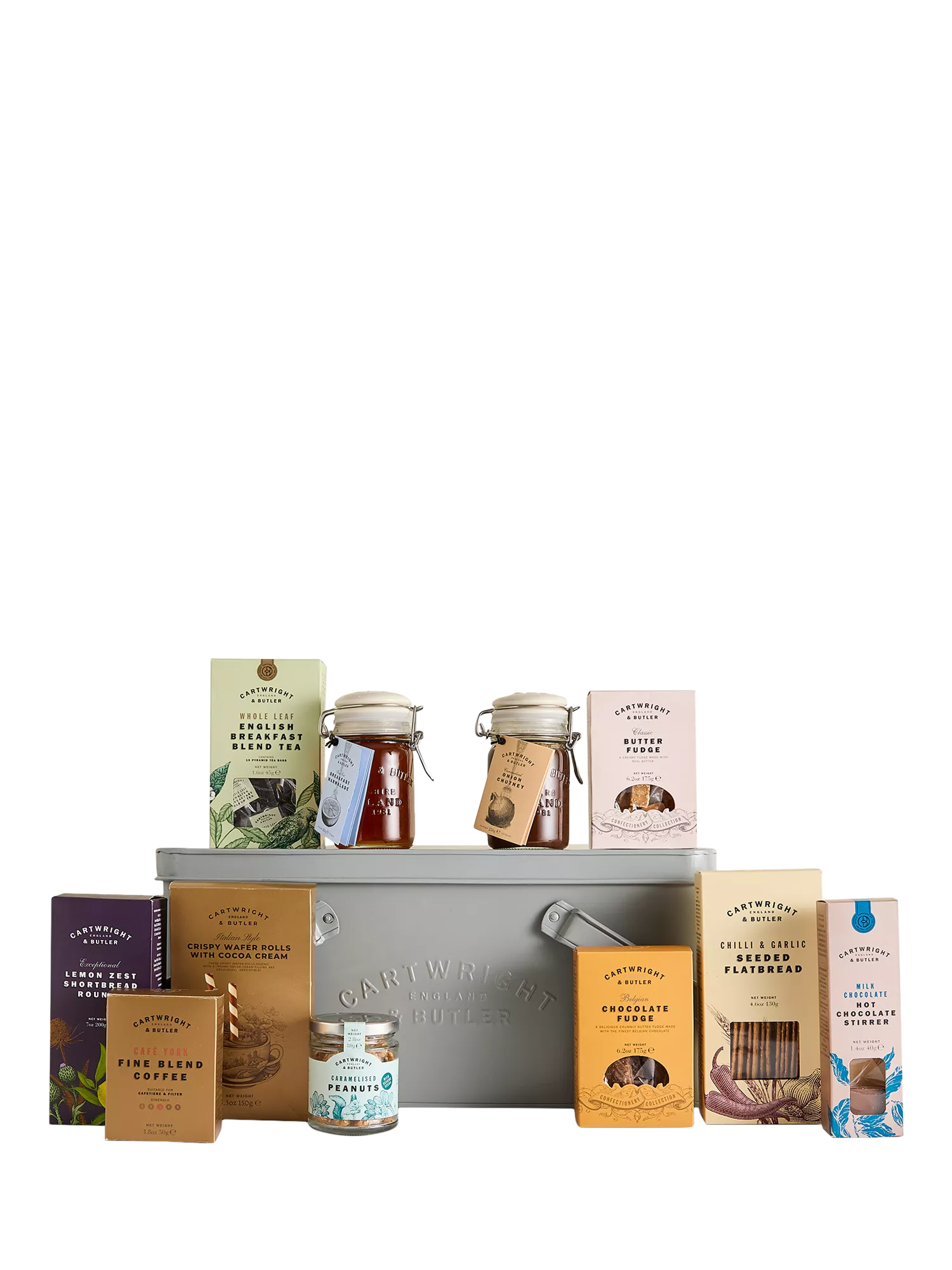 Cartwright and Butler's best selling Pocklington Luxury Picnic Hamper is a delightful selection of the finest treats inside a beautiful classic hamper tin. Delve into this delicious collection where you will discover a full-bodied traditional English Breakfast tea along with Café York blend medium roast coffee, ready to be brewed to perfection - a warm kick-start to the day. Explore an array of sweet and savoury treats, ranging from sweet chilli flatbreads, caramelised onion chutney and caramelised sesame peanuts through to crumbling lemon zest shortbread, crispy wafer rolls with cocoa cream and butter fudge designed to appeal to every palate.