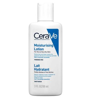 This lightweight CeraVe lotion provides instant and long-lasting hydration for up to 24 hours on the face and body. It is formulated for normal to dry skin types, and is also noted as suitable for eczema-prone skin. Developed with dermatologists, this travel-sized lotion supports skin health effectively.