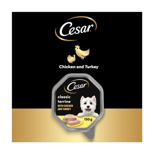 Cesar Dog Food Classic Terrine with tender chicken and turkey dog food in jelly is a succulent, hearty and 100% complete meal, carefully prepared with healthy, natural ingredients that your dog will simply adore. A complete dog food to ensure your dog enjoys a whole host of nutrients to keep them happy and healthy, all in a tasty wet dog food.