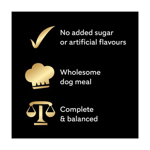100% complete & balanced nutrition in tasty wet dog food pouches in sauce, including, Beef & carrots; chicken & vegetables; lamb & peas; turkey & carrots