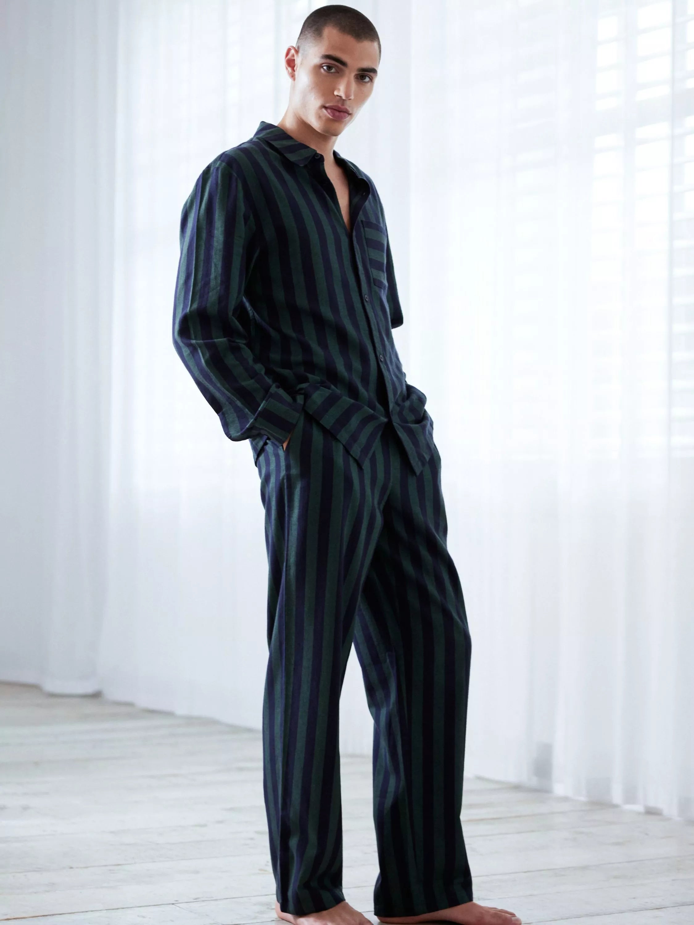 A quintessential button up pyjama set from Chelsea Peers, these stripe flannel pjs are given a modern twist with offset stripes patch chest pockets.
