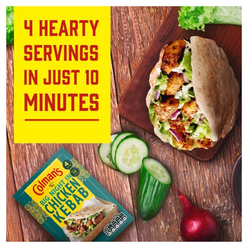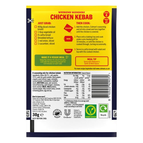 Read MoreEnjoy a delicious, fakeaway family meal within minutes with Colman's Weekend Wonders Chicken Kebab Meal Maker. This seasoning mix is suitable for vegetarians and free from artificial colours and preservatives, making cooking one of the UK's favourite meals a simple pleasure for everyone around your table. When you've got our Chicken Kebab Meal Maker on hand, all you'll need is some diced chicken, shredded lettuce, red onion and cucumber to whip up a delicious dish. Add the chicken, the contents of Colman's seasoning packet and a little oil into a bowl, and toss together until the chicken is covered. Place onto a baking tray and cook under a preheated grill for 10 minutes or until the chicken is cooked through, turning occasionally. Serve the cooked chicken in a pitta with salad, and that's it - you can now enjoy the rich, full flavour of a takeaway-style chicken kebab! Alternatively, you can swap the chicken for diced firm tofu, coat it with the spice mix and grill for 6-8 minutes on each side. At Colman's, we believe you deserve the very best. That's why we select quality ingredients for all our recipes to deliver great-tasting family favourites such as our cooking sauces. We provide the flavour, you provide the imagination - what will you rustle up today? Be sure to check out the rest of our Midweek Meals, Classic Comforts and Weekend Wonders ranges. This meal maker recipe mix comes in paper packaging. Please recycle.