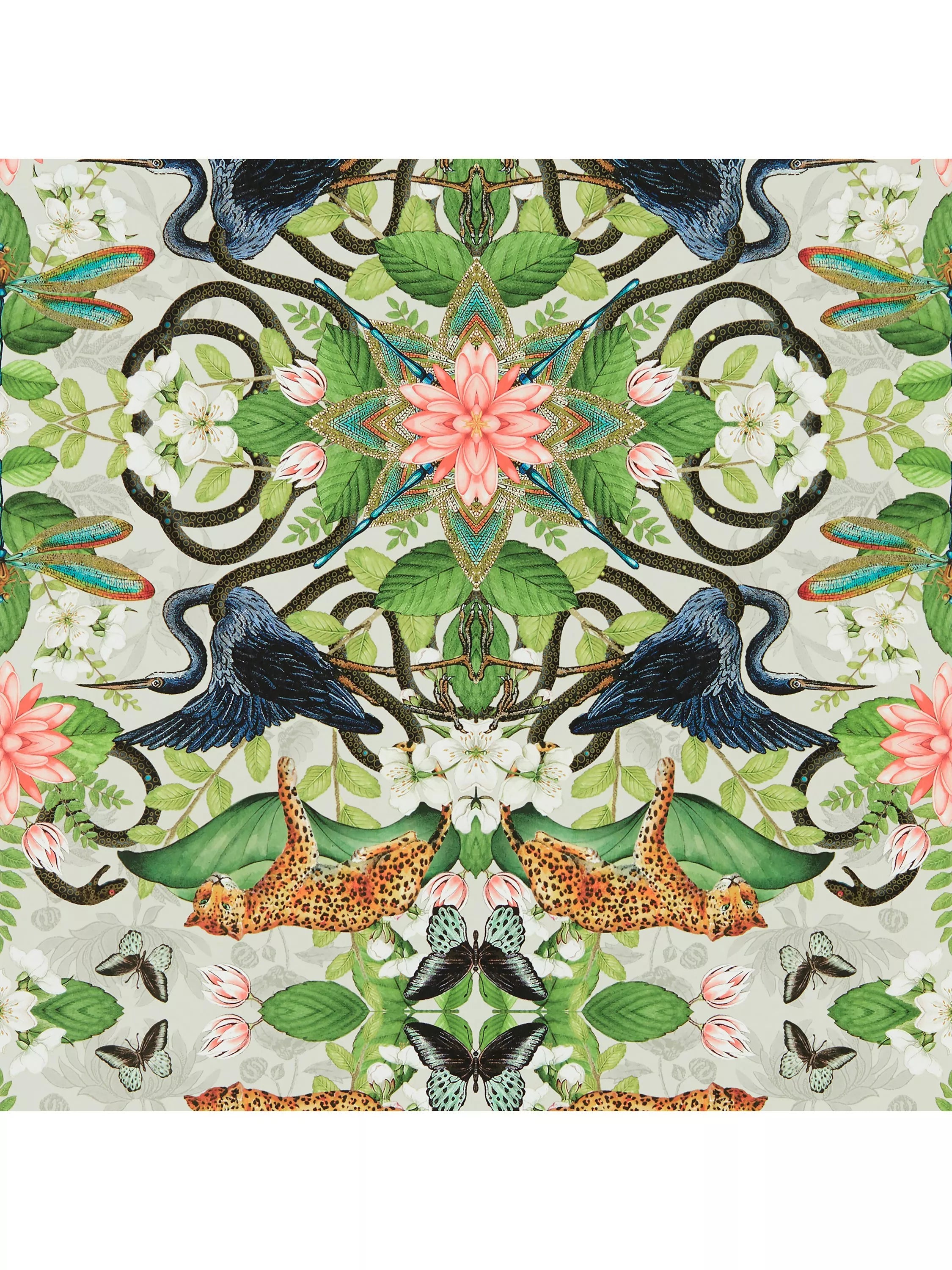 From the Amazon basin's tropical heat, to the humid jungles of Vietnam, harness the spirit of wanderlust and discover exotic, uncharted territories. Celebrating the world s most unusual flora and fauna, make a statement with this bold, kaleidoscopic wallpaper as it encounters butterflies, birds, leopards and snakes hidden amongst unexpected patterns.None