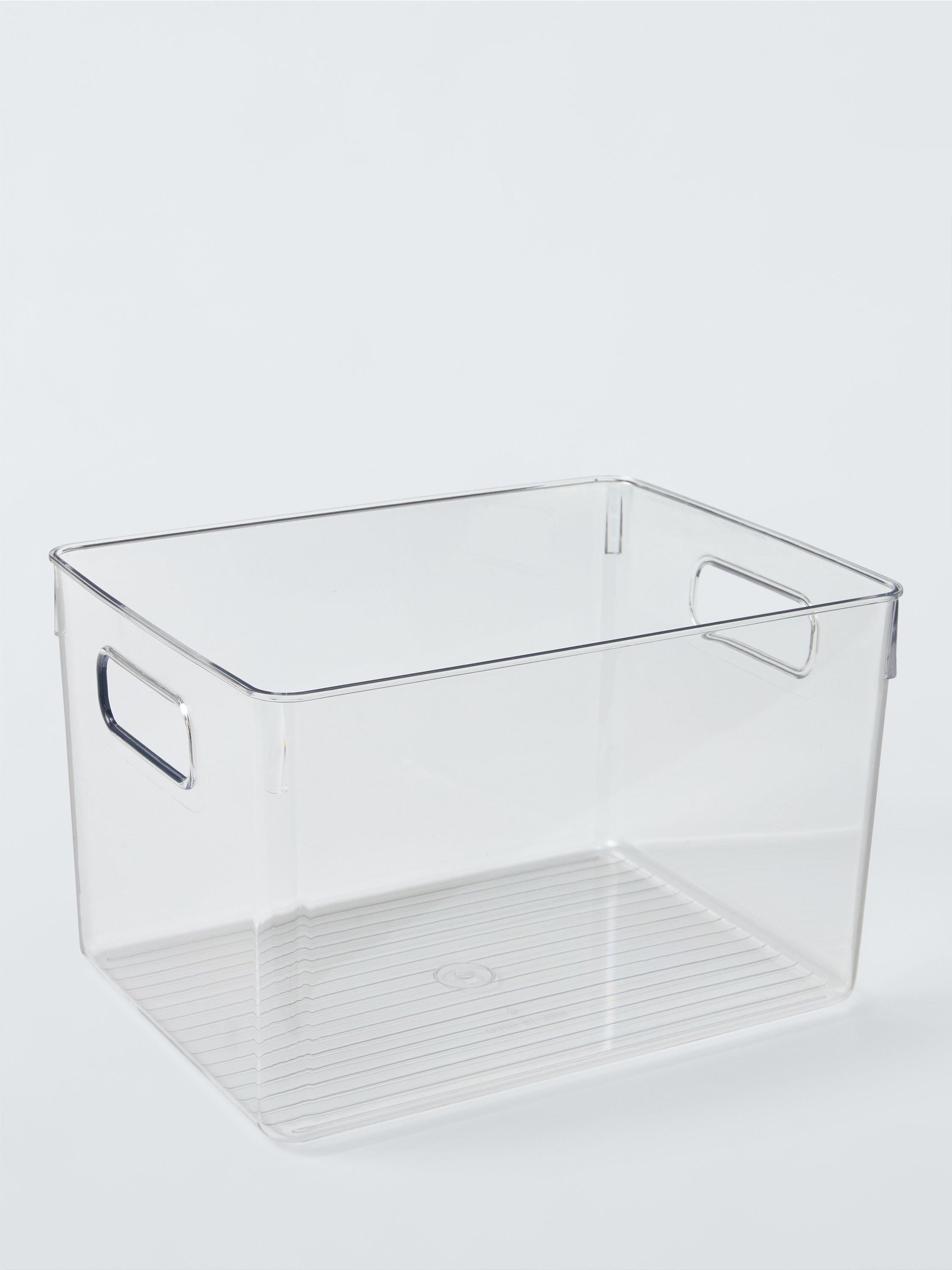 John Lewis Large Clear Plastic Storage Box assists with your home tidying efforts across any living space instantly. This multi-purpose container provides a generous capacity, ideal for storing everything from children's toys to spare bed linens securely. Its design includes strong handles for simple movement and clear plastic walls enabling quick content identification easily.