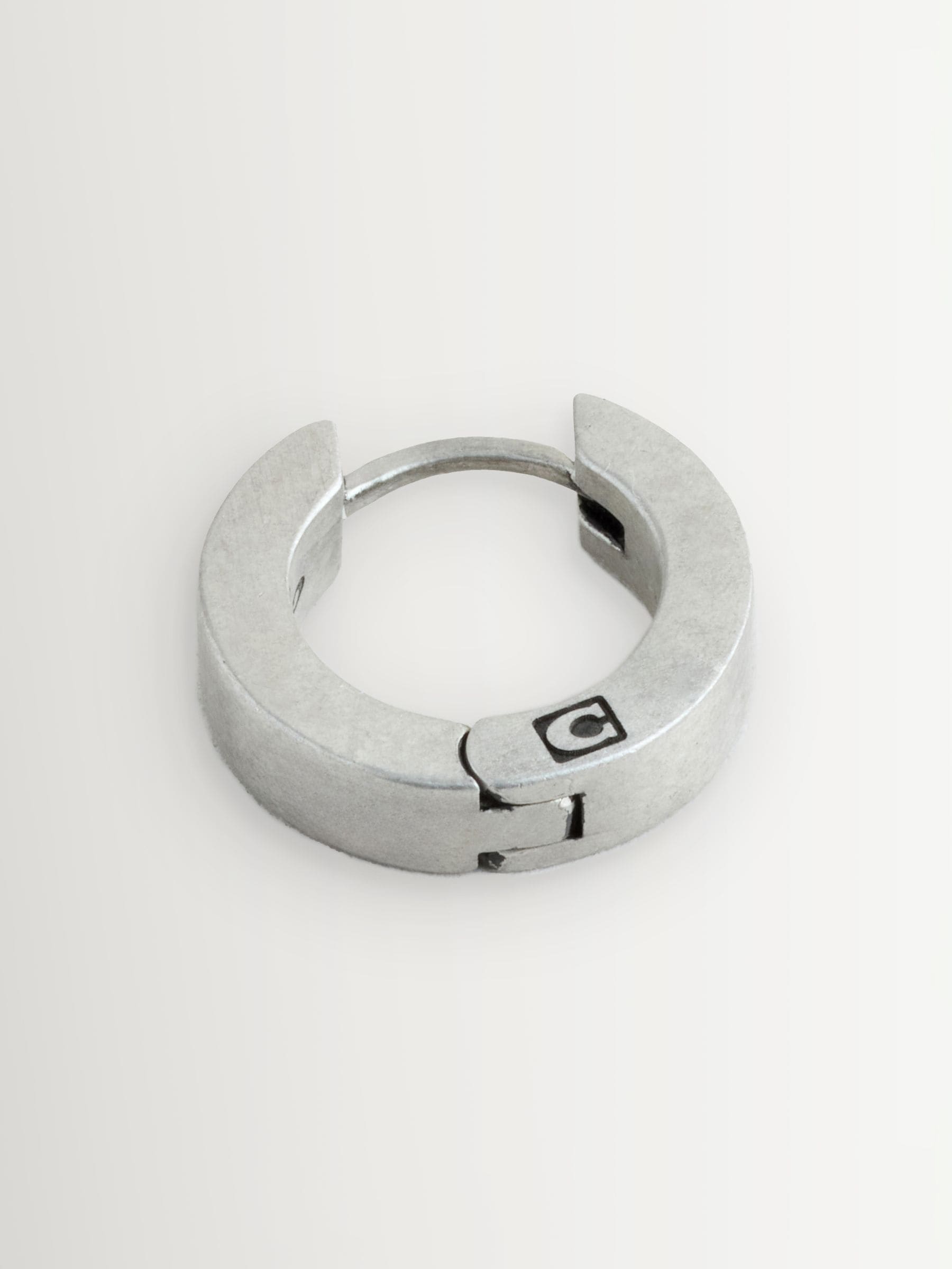 Sterling silver signature hallmark huggie perfect for everyday. Includes 1 single-huggie. Earrings has a hinge closure. Made from sterling silver. Includes signature COACH jewelry pouch. Dimensions - Length: 12.7 mm, Width: 2.54 mm, Huggie Diameter: 7.62 mm.