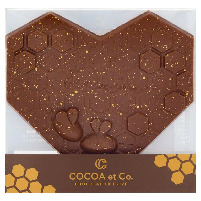 This Cocoa et Co Bee Mine is a charming milk chocolate heart shaped bar, ideal for special moments or as a thoughtful gesture. It is presented with an edible golden decoration, adding a touch of elegance to the confectionery. The bar is made using rich milk chocolate combined with essential ingredients for texture and taste.